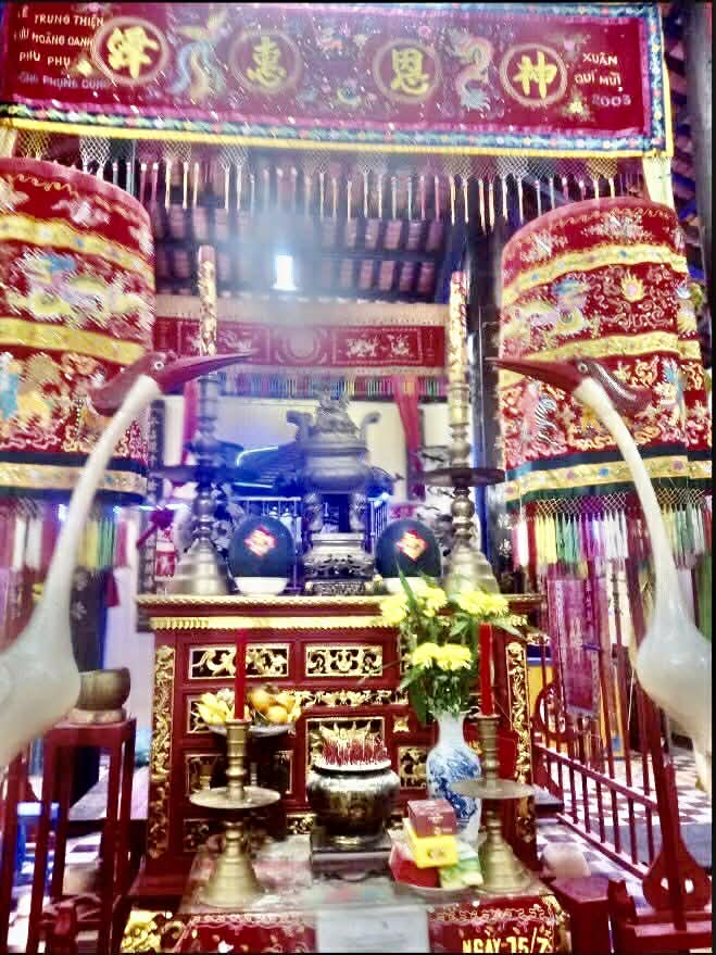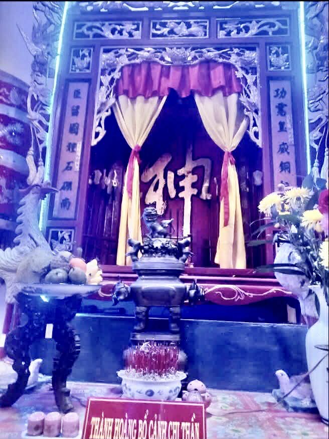 Sát vách trong cũng đúng là nơi đặt bàn thờ Thần Thành Hoàng. Tôi hơi lạ vì khác với cái vẻ nghiêm trang cổ kính chung quanh, chữ Thần rất to trên bàn thờ lại được tô phết khá vụng về, khó đọc! Tuy nhiên hai bên bàn thờ Thần là hai bàn thờ Tả ban và Hữu ban lại vẫn đúng cách như thông lệ.